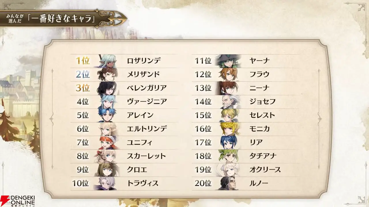 Various poll results, such as players’ favorite songs, scenes, and classes, were showcased. One particularly notable poll revealed the top ten most popular characters from a recent vote. The fan-favorite Rosaline is at the top, probably surprising no one.