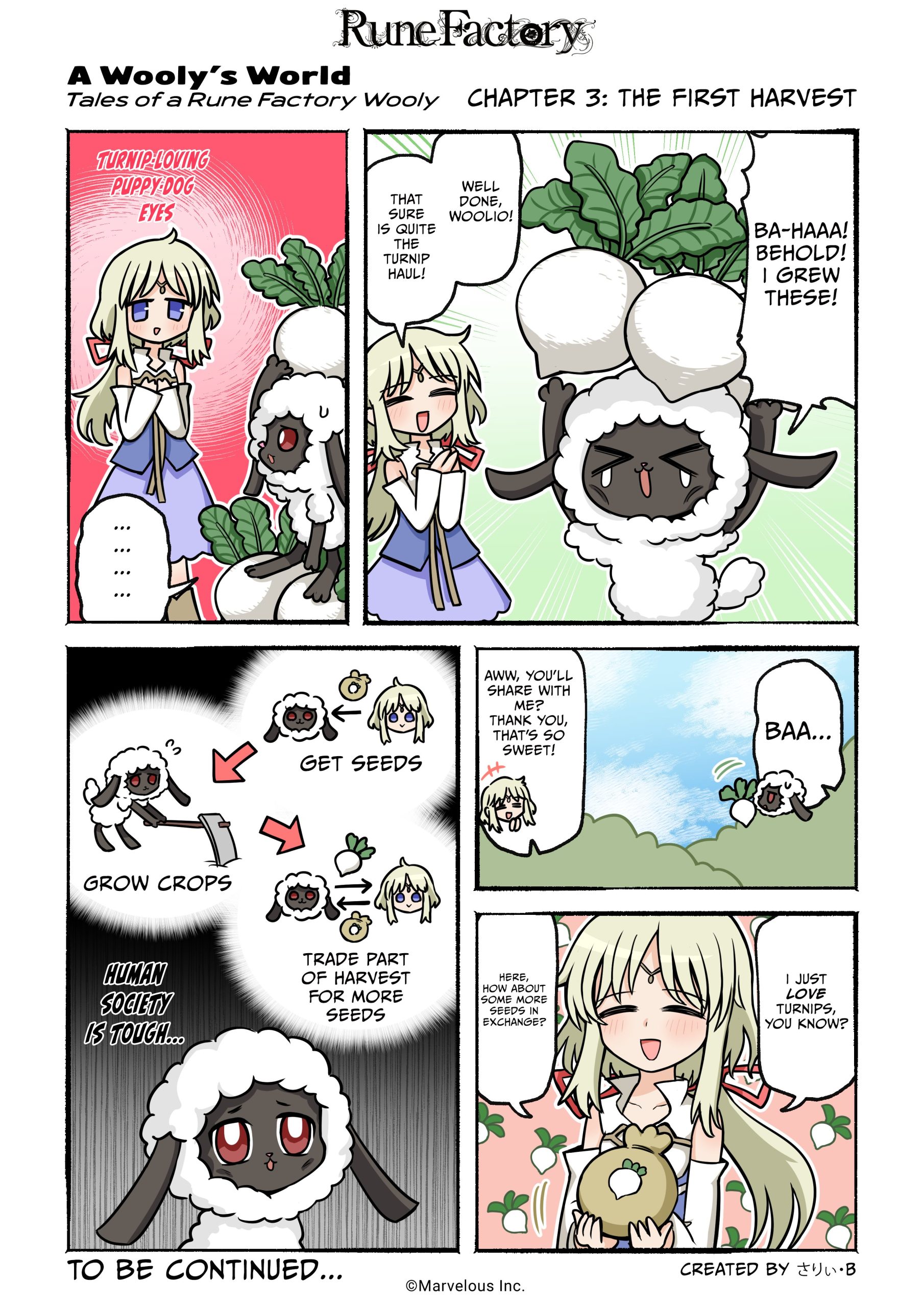 Read from left to right; the third chapter continues to highlight Mist from the first entry in the Rune Factory franchise interacting with the mascot, Wooly.